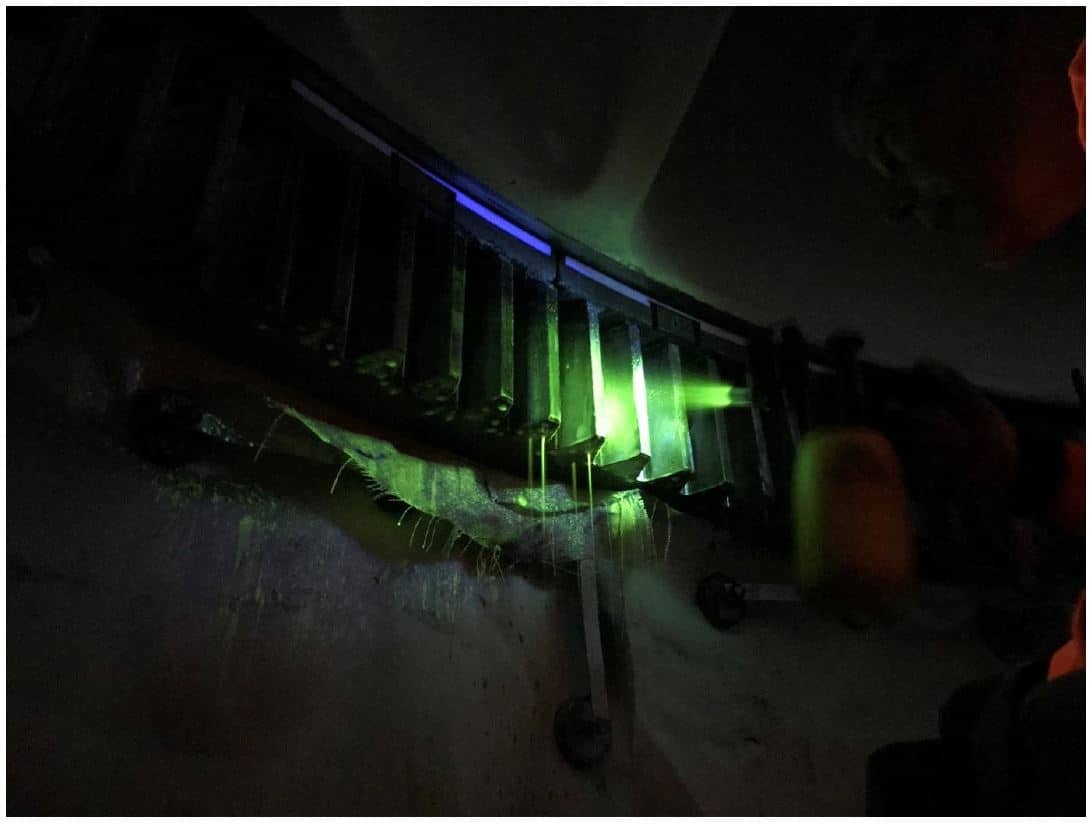 Die Bilder zeigen den Zustand vor und nach der Bearbeitung einschließlich der Arbeitsschritte: Vorwärmen, Schweißnahtreparatur, Schleifen und zerstörungsfreie Prüfung.